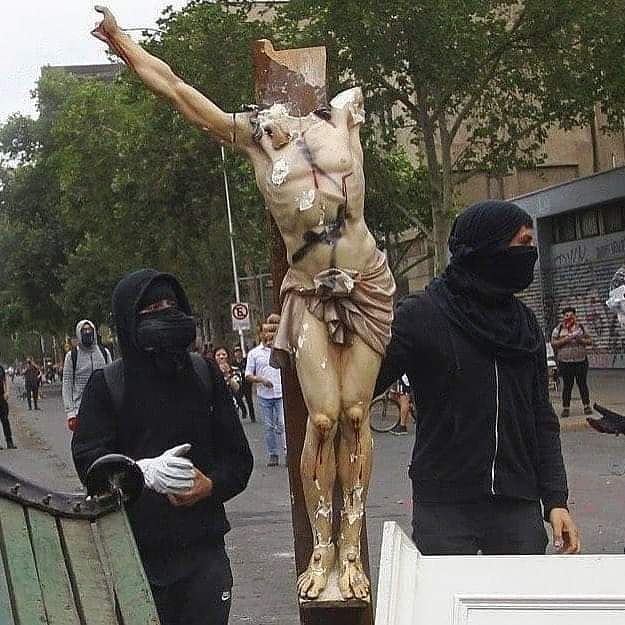 Con una imagen del Crucificado, roto por manifestantes encapuchados en Santiago de Chile, he posteado que, ante semejante figura, nuestro dolor de cristianos no debe ceder ni a la rabia ni al odio. Nos duele en el alma contemplar una figura ante la que muchos rezamos e incluso hemos decidido cosas importantes de nuestra vida.