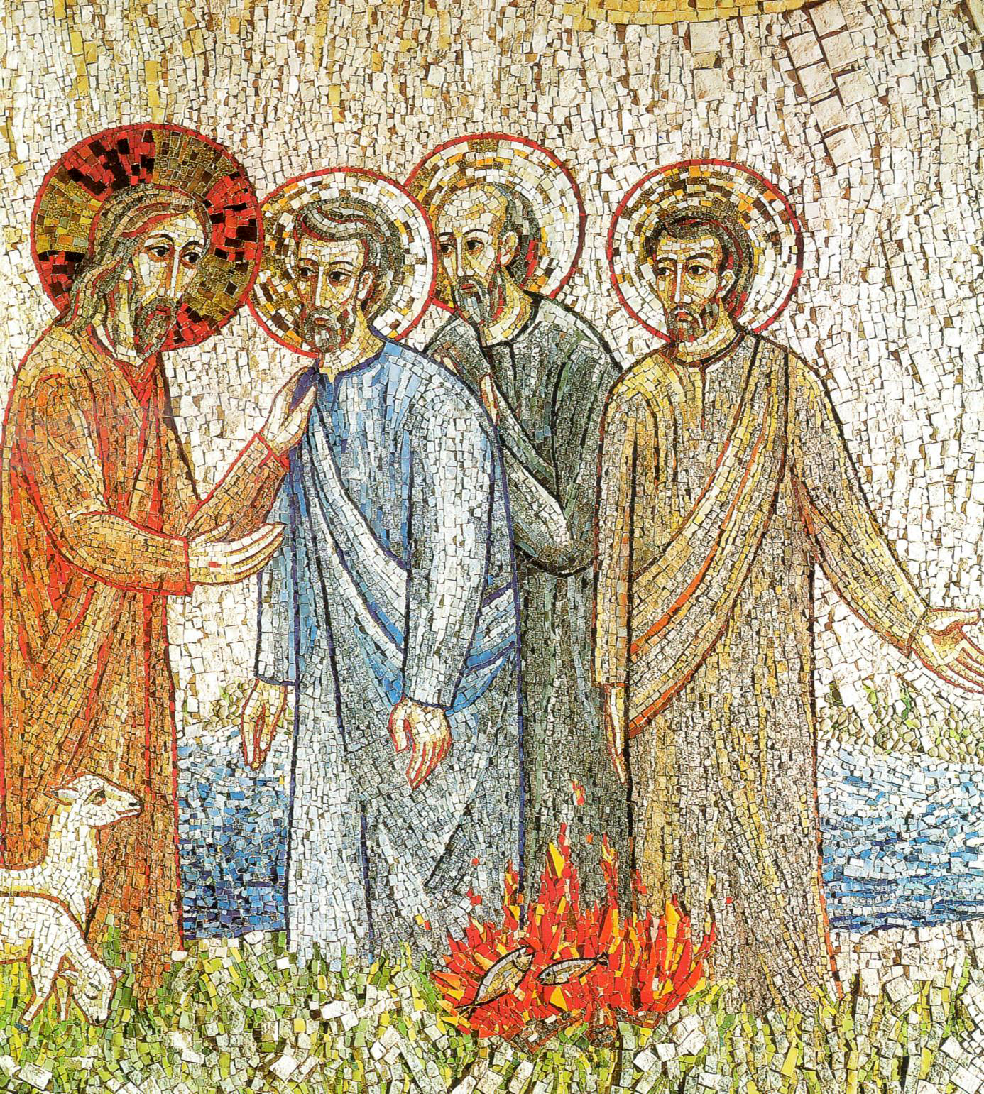 “El discípulo al que Jesús amaba dijo a Pedro: «¡Es el Señor!». Cuando Simón Pedro oyó que era el Señor, se ciñó la túnica, que era lo único que llevaba puesto, y se tiró al agua […] Le preguntó por tercera vez: «Simón, hijo de Juan, ¿me quieres?». Pedro se entristeció de que por tercera vez le preguntara si lo quería, y le dijo: «Señor, tú lo sabes todo; sabes que te quiero». Jesús le dijo: «Apacienta mis ovejas.” (Jn 21, 7. 17).