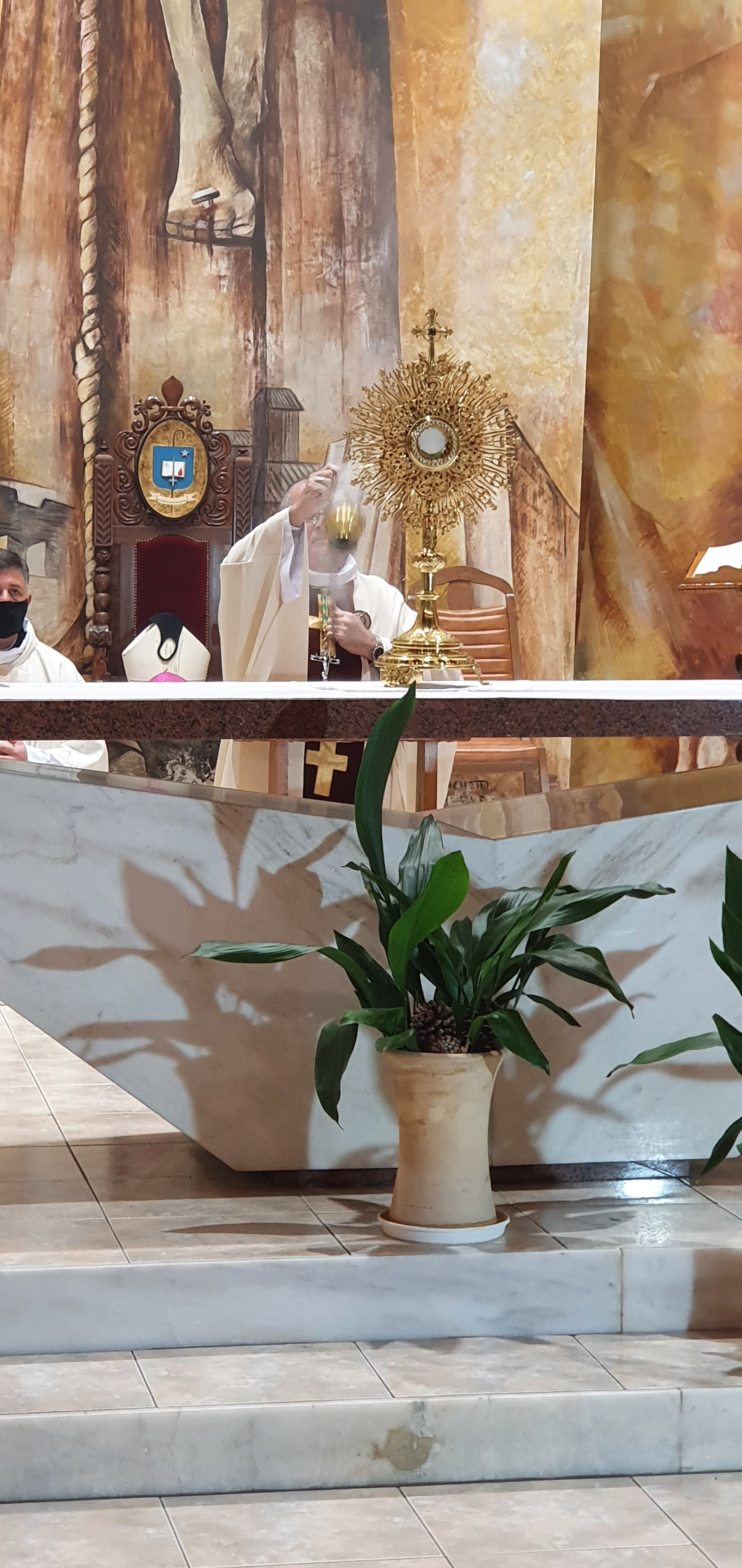 Por eso estamos aquí, reunidos para cantar el misterio del amor grande que nos alcanza bajo las apariencias del pan y del vino.